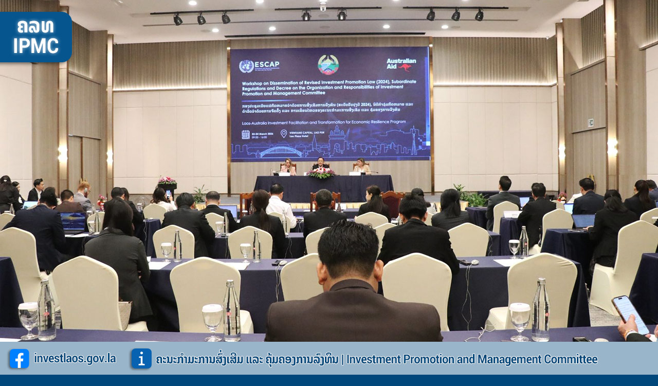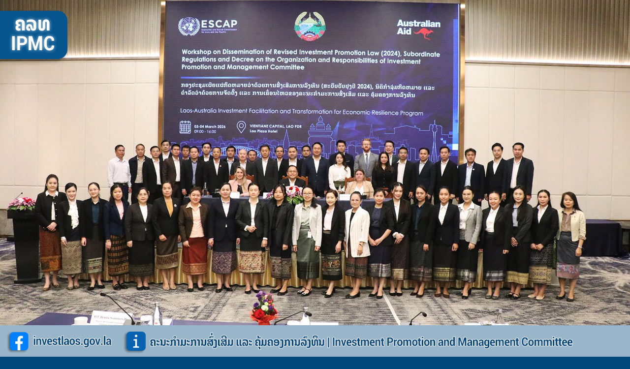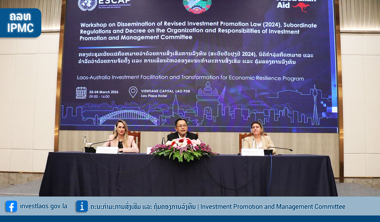 ຫ້ອງການ ຄະນະກໍາມະການສົ່ງເສີມ ແລະ ຄຸ້ມຄອງການລົງທຶນ, ໄດ້ຈັດກອງປະຊຸມເຜີຍແຜ່ກົດໝາຍ ສົ່ງເສີມການລົງທຶນສະບັບປັບປຸງປີ2024, ນິຕິກຳໃຕ້ກົດໝາຍ ກ່ຽວກັບວຽກງານສົ່ງເສີມ ແລະ ຄຸ້ມຄອງການລົງທຶນພາກເອກະຊົນ ແລະ ດຳລັດວ່າດ້ວຍການຈັດຕັ້ງ ແລະ ການເຄື່ອນໄຫວຂອງຄະນະກໍາມະການສົ່ງເສີມ ແລະ ຄຸ້ມຄອງການລົງທຶນ, ໃນວັນທີ 3 ມີນາ2026 ທີ່ໂຮງແຮມ ລາວພລາຊາ, ພາຍໃຕ້ການເປັນປະທານຮ່ວມ ຂອງທ່ານ ວັນທະນາ ນໍລິນທາ, ຫົວໜ້າຫ້ອງການຄະນະກໍາມະການສົ່ງເສີມ ແລະ ຄຸ້ມຄອງການລົງທຶນ, ທ່ານ ນາງ ເບັນນິຕ້າ ຊໍາເມີວິວ (Benita Sommerville) ຮອງເອກອັກຄະລັດຖະທູດອົດສະຕຣາລີ ປະຈໍາ ສປປ ລາວ, ທ່ານ ນາງເຮເທີ ລີນ ເທເລີ-ສເຕຣົາ, ເຈົ້າໜ້າທີດ້ານເສດຖະກິດ ຄະນະກຳມະການເສດຖະກິດ ແລະ ສັງຄົມແຫ່ງ ສະຫະປະຊາຊາດ ສຳລັບພາກພື້ນອາຊີ-ປາຊິຟິກ(ESCAP).